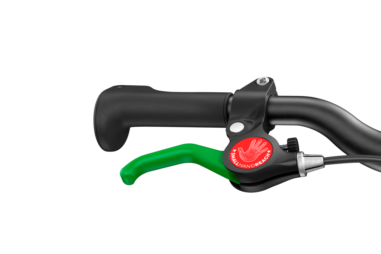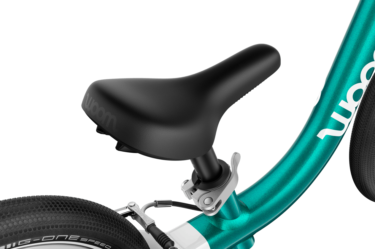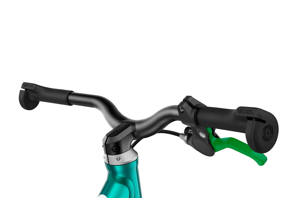 - Child-friendly brake levers: It's so important that your child can brake safely whenever they need to, so all our woom GO balance bikes have child-friendly hand brakes. Your child will immediately be able to spot the all-important rear brake because the lever and rear brake pads are both green. Plus, you can make sure they can easily reach the brake by adjusting the distance between the lever and the grip using the little barrel adjuster.