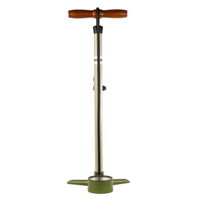 Terra maintains SILCA's famous all metal construction with lathe turned Ash wood handle, but breaks the traditional SILCA mold with a unique lever operated chuck based on SILCA's own award winning Tattico mini pump chuck design. This full metal chuck uses a threaded reversible end cap to switch between presta and schrader and contains an inline pressure bleed button. The Terra pump will move 318 cubic centimeters with each stroke.